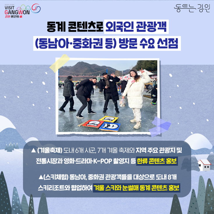동남아 중화권 외국인 관광객 방문 수요 선점을 위해 전통시장과 영화, 드라마 촬영지 등 한류 콘텐츠와 도내 8개 스키리조트와 협업하여 겨울 스키, 눈썰매 등 강원 동계관광 특화 콘텐츠를 즐길 수 있게 하였습니다.