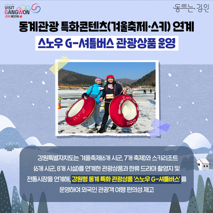 1월부터 3월까지는 겨울축제, 스키 등 동계관광 특화콘텐츠와 연계하여 외국인 관광객들이 편리하게 강원 동계관광 상품을 즐기도록 ‘2025 스노우 G-셔틀버스’를 운영합니다.