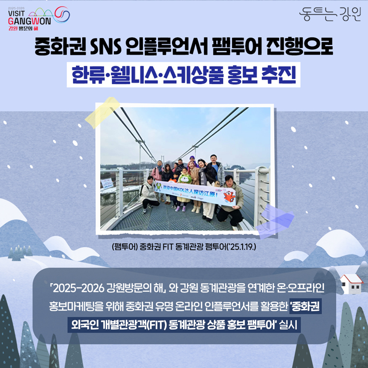 1월 19일부터 22일까지 중화권 SNS 인플루언서를 초청해 강원특별자치도 내 유명 관광명소들을 체험 후 중화권 온라인 플랫폼에 홍보하는 팸투어를 실시했습니다.