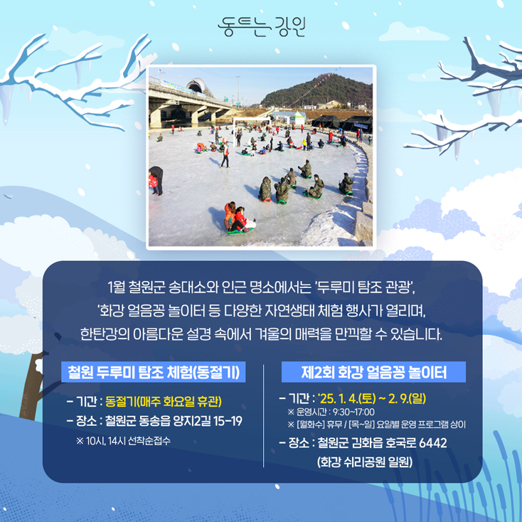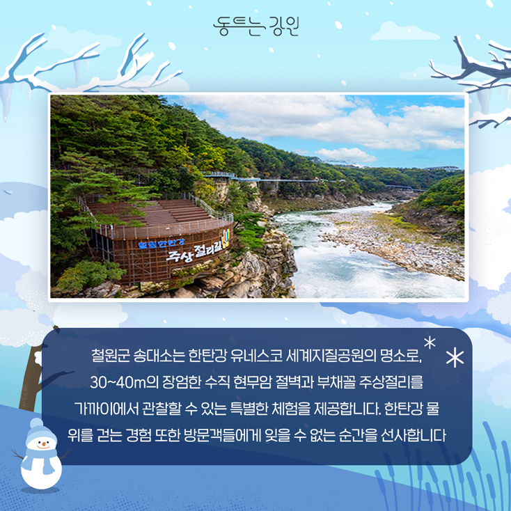 겨울철 아름다운 한탄강의 겨울 설경과 함께, 송대소를 방문하여 자연의 신비로움을 직접 경험해 보기를 추천합니다.