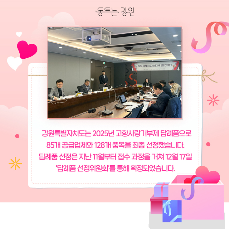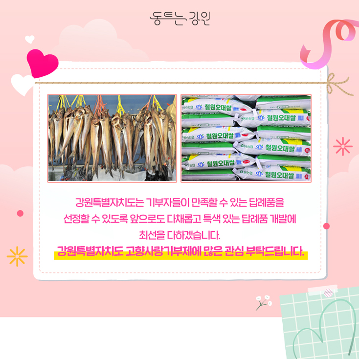 기부자에게는 강원특별자치도의 특색있는 답례품과 세액공제 혜택 뿐만 아니라 도내 지역경제활성에 기여하는 강원특별자치도 고향사랑기부제에 많은 관심 부탁드립니다.