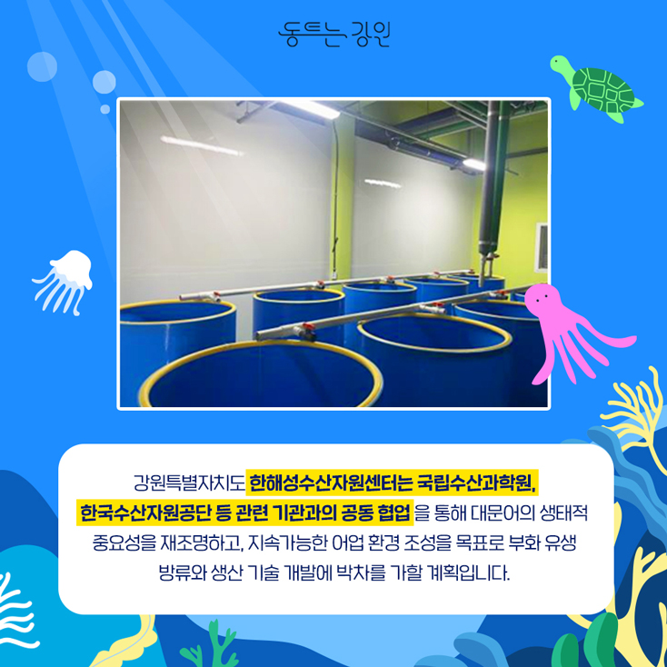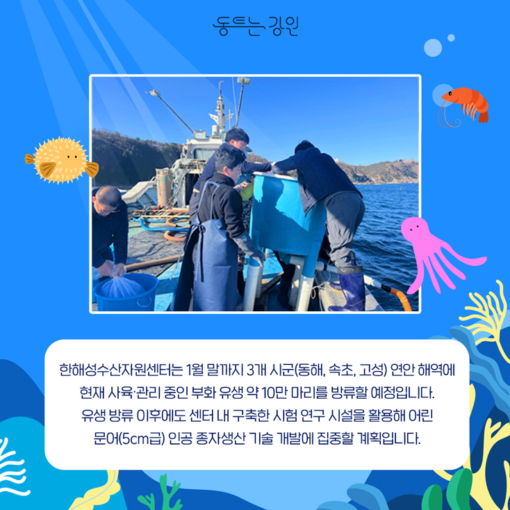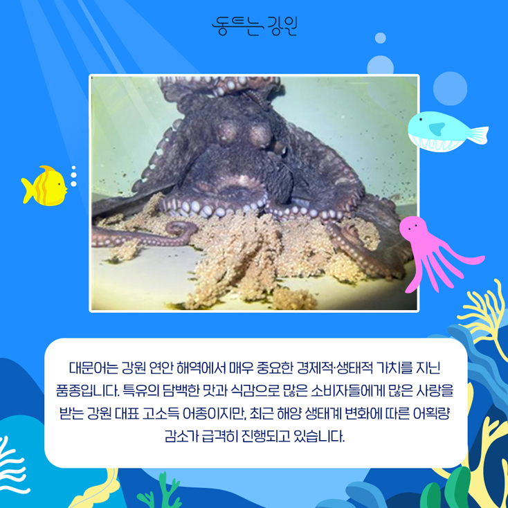 최근 대문어 자원의 감소가 우려되는 가운데, 부화 유생 방류와 어린 문어(5cm급 이상) 인공 종자생산 기술 개발을 위한 시험 연구에 본격 착수할 계획입니다.