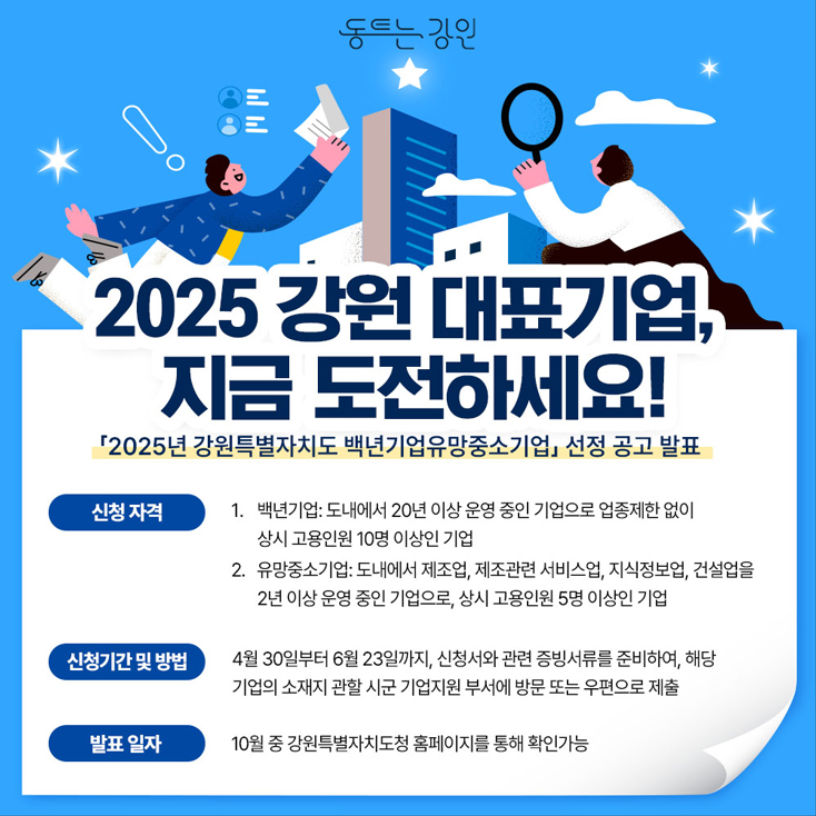 강원특별자치도에서는 2025년 강원특별자치도 백년기업 및 유망중소기업을 선정합니다. 2003년부터 현재까지 백년기업 57개사, 유망중소기업 652개사 총 709개사가 선정되었으며, 올해는 백년기업 5개사 내외, 유망중소기업 25개사(신규 15, 재인증 10) 내외를 선정할 예정입니다.