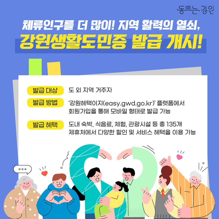 강원특별자치도가 지역경제 기여도가 높은 생활인구 유치와 지역활력 증진을 위해 강원생활도민증 발급을 실시합니다.