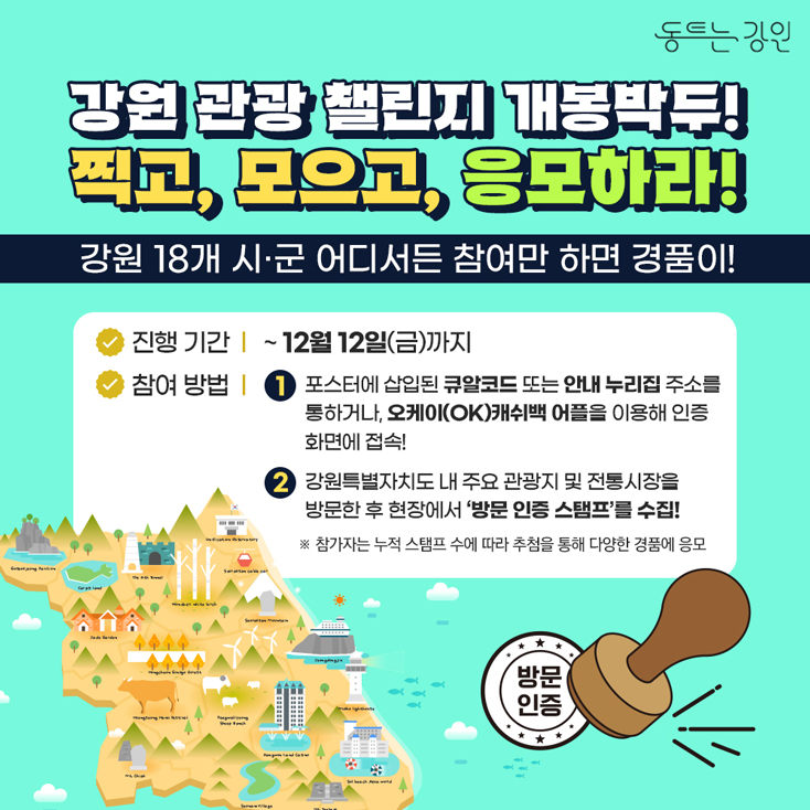 2025~2026 강원 방문의 해」를 맞아, 강원 18개 시군 주요 관광지 및 전통시장을 방문 인증 스탬프를 수집하면 추첨을 통해 다양한 경품을 제공하는 이벤트를 운영합니다.