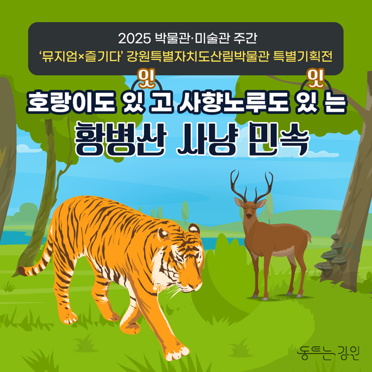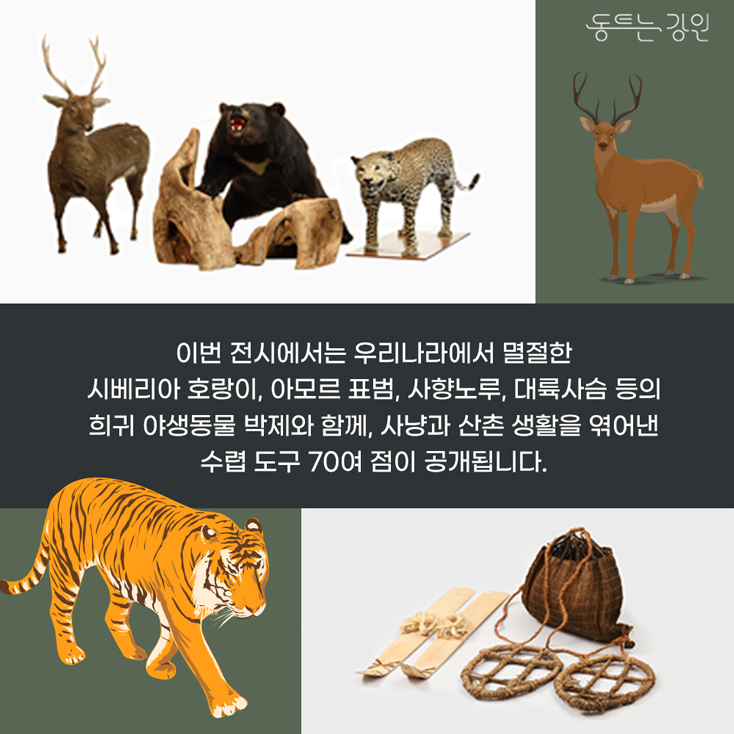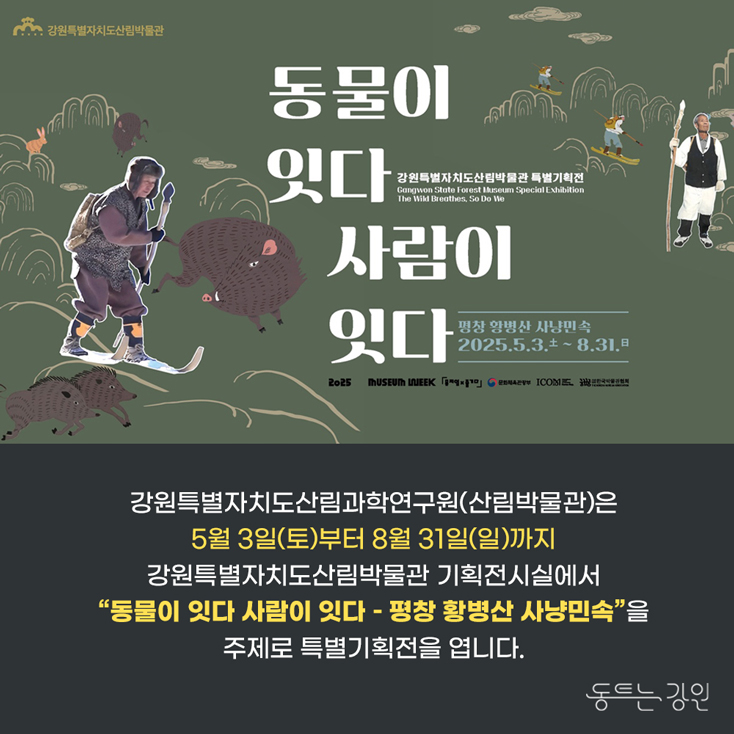 5월3일(토)부터 8월31일(일)까지 강원특별자치도산림박물관 기획전시실에서 “동물이 잇다 사람이 잇다 – 평창 황병산 사냥민속” 을 주제로 특별기획전을 진행합니다.