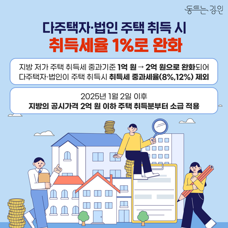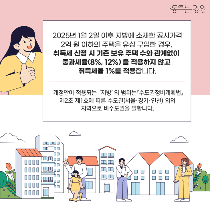 2025년 1월 2일 이후 지방에 소재한 공시가격 2억 원 이하의 주택을 유상 구입한 경우, 취득세 산정 시 기존 보유 주택 수와 관계없이 중과세율(8%, 12%) 을 적용하지 않고 취득세율 1%를 적용합니다.