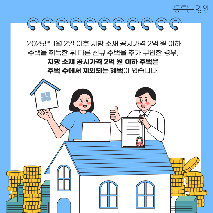 2025년 1월 2일 이후 지방 소재 공시가격 2억 원 이하 주택을 취득한 뒤 다른 신규 주택을 추가 구입한 경우, 지방 소재 공시가격 2억 원 이하 주택은 주택 수에서 제외되는 혜택이 있습니다.