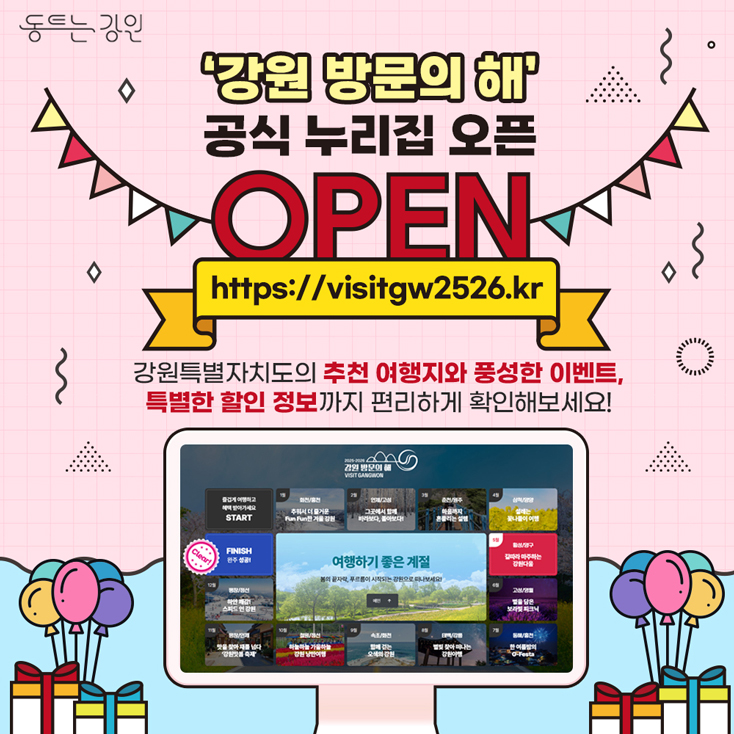‘2025-2026 강원 방문의 해’를 맞아 다양한 관광 정보와 혜택을 편리하게 확인할 수 있는 『강원 방문의 해 공식 누리집(visitgw2526.kr)』이 오픈했습니다.