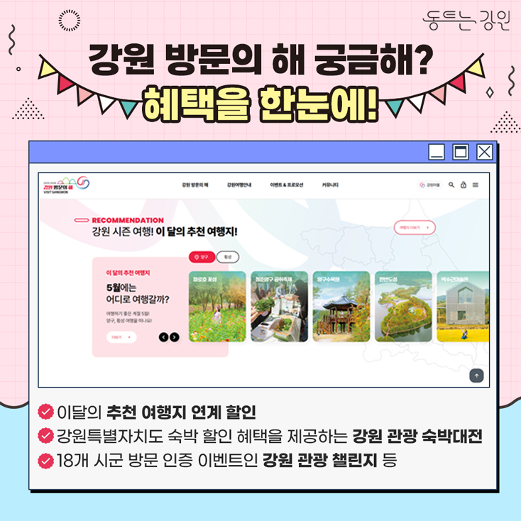 ‘강원 방문의 해 누리집’은 강원 방문의 해 주요 사업은 물론 매달 추천하는 여행지와 풍성한 이벤트, 특별 할인 정보를 제공하여 도를 찾는 관광객들에게 더욱 편리하고 효율적인 여행 정보를 전달하기 위해 개설되었습니다.