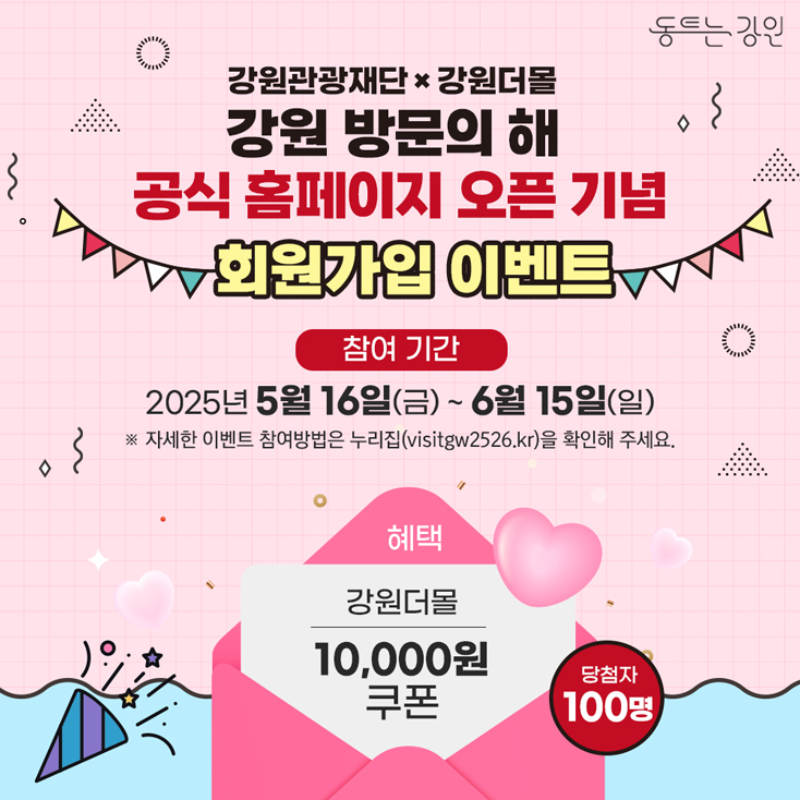공식 누리집 개설을 기념하여 회원가입 이벤트가 6월 15일까지 진행됩니다. 이벤트는 강원 방문의 해 누리집과 강원관광재단 인스타그램(https://www.instagram.com/gwto_official/)을 통해 참여 가능하며 추첨을 통하여 강원더몰 상품권을 증정합니다.