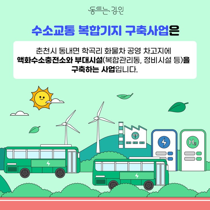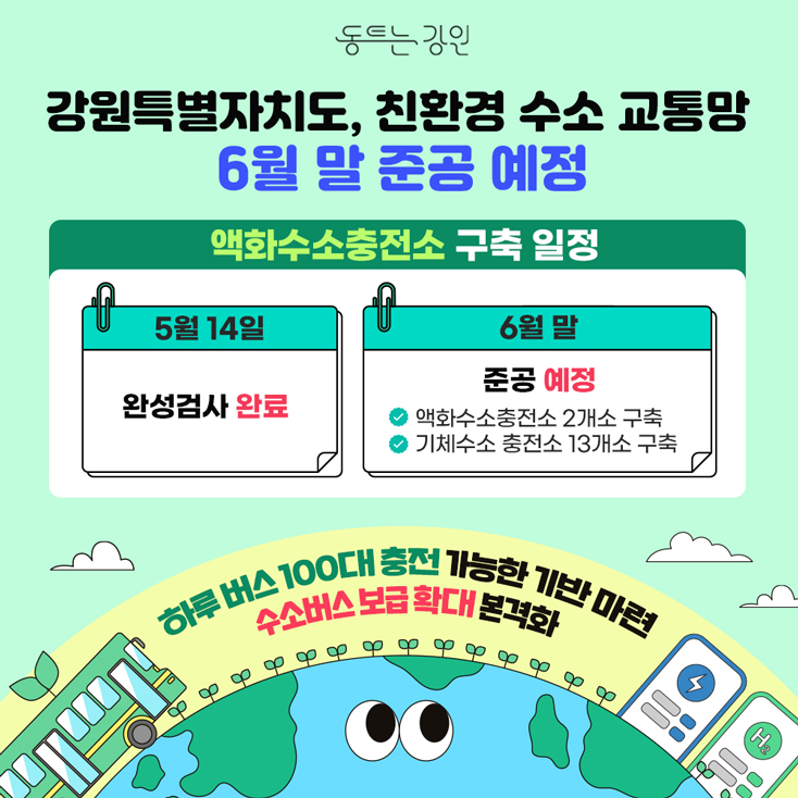 이번 수소교통복합기지 내 액화수소충전소 오는 6월 준공으로 도는 액화수소충전소 2개소(춘천, 원주) 및 기체수소 충전소 13개소를 구축 완료하게 됩니다.