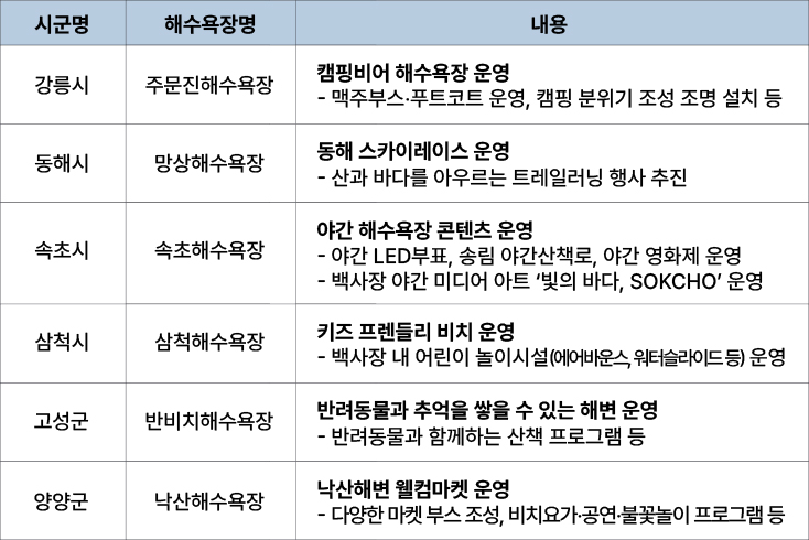 특히, 6월 28일 경포해변을 시작으로 8월 24일까지 도내 6개 시군, 88개 해수욕장이 개장하며, 특화 테마 해변도 운영됩니다.