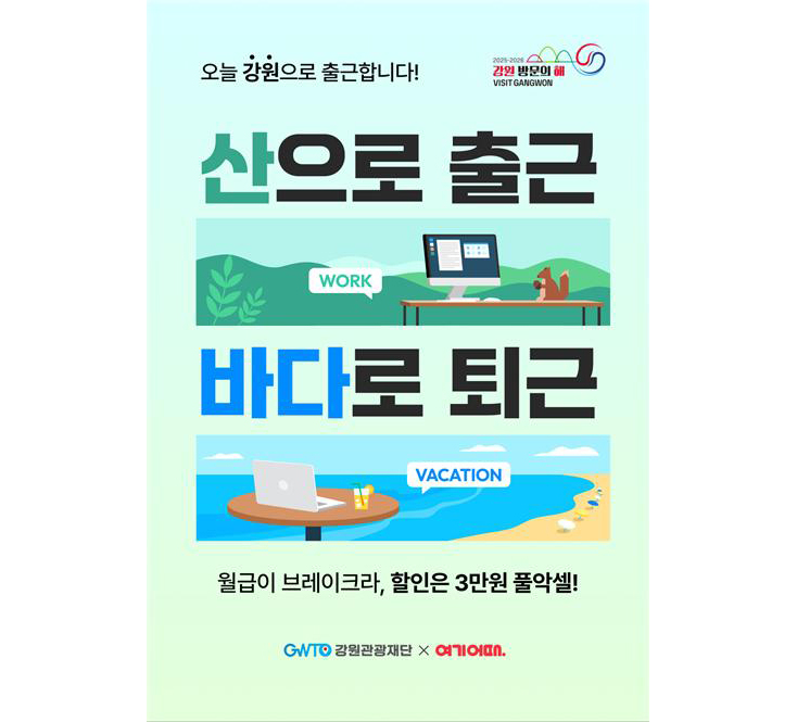 강원특별자치도와 강원관광재단은 비수기·주중 체류 분산과 소비 확대를 위해 8월 25일부터 12월까지 숙박·여행 플랫폼 ‘여기어때’와 함께 휴가지 원격근무(워케이션) 기획전을 운영합니다.