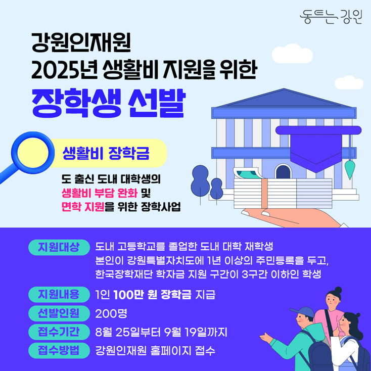 강원인재원이 생활비 장학금 장학생 200명을 선발합니다.