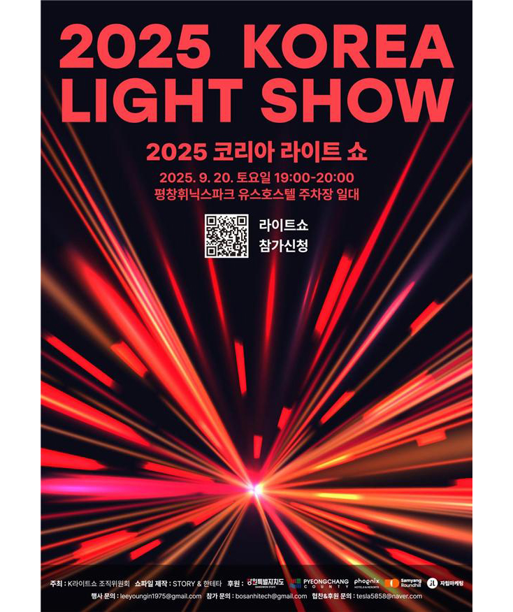 ‘2025–2026 강원 방문의 해’를 맞아 오는 2025년 9월 20일(토) 19시부터 평창 휘닉스파크에서 세계 최대 규모의 차량 기반 미디어 퍼포먼스인 ‘테슬라 케이 조명쇼(K-라이트쇼) 2025’를 엽니다.