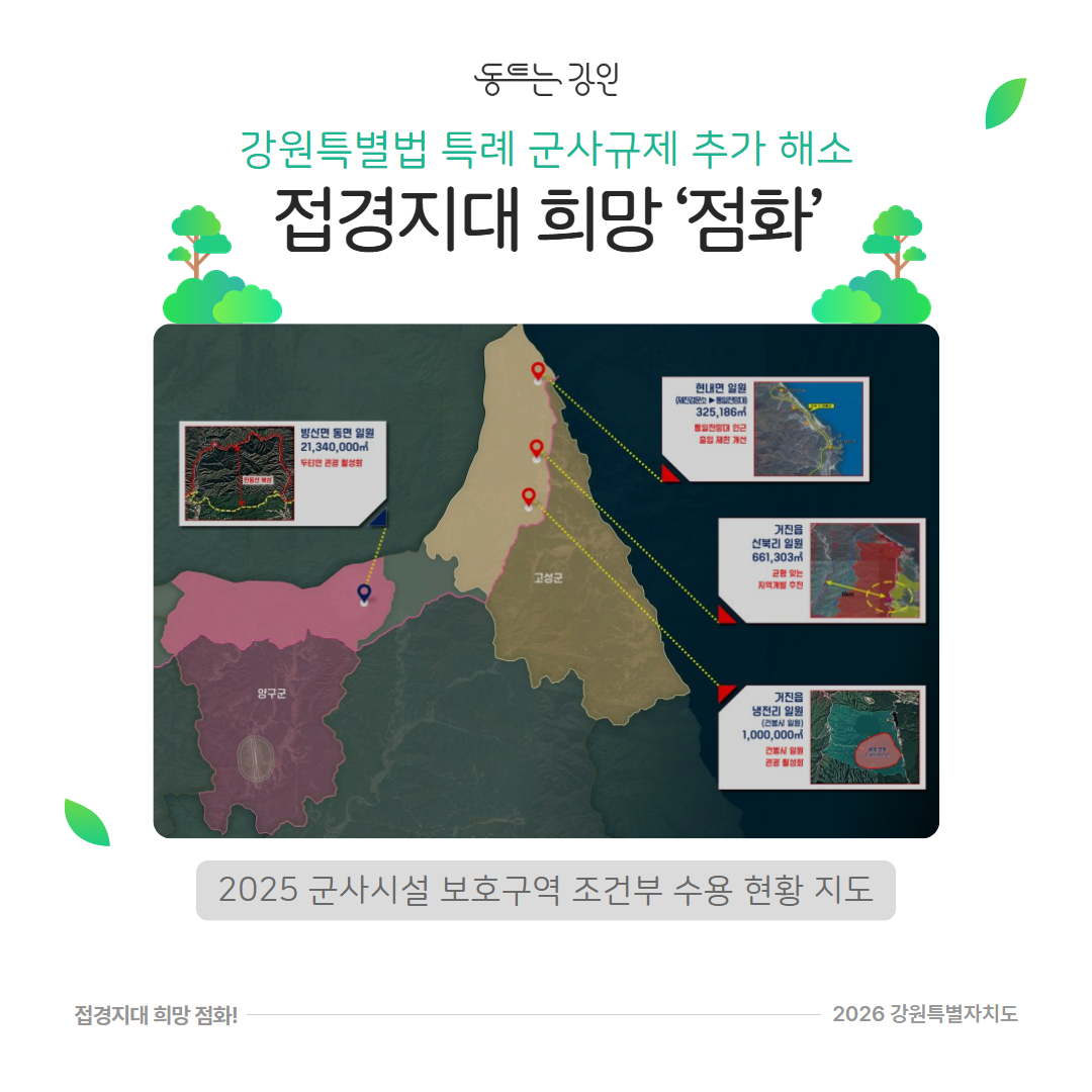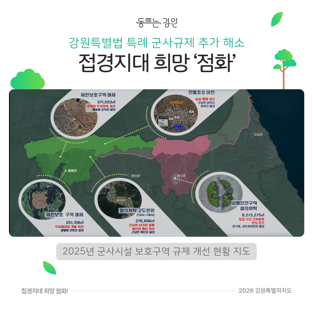강원특별자치도는 강원특별법 특례를 적극 활용, 도내 접경 지역 약 32.47㎢(여의도 면적의 11배)에 달하는 군사 규제가 추가로 해소됐습니다. 지난 2025년 3월 철원·화천의 민통선 북상에 이어, 이번 추가 군사 규제 해소로 낙후되었던 접경 지역에 새로운 활력을 불어넣을 것으로 기대됩니다.